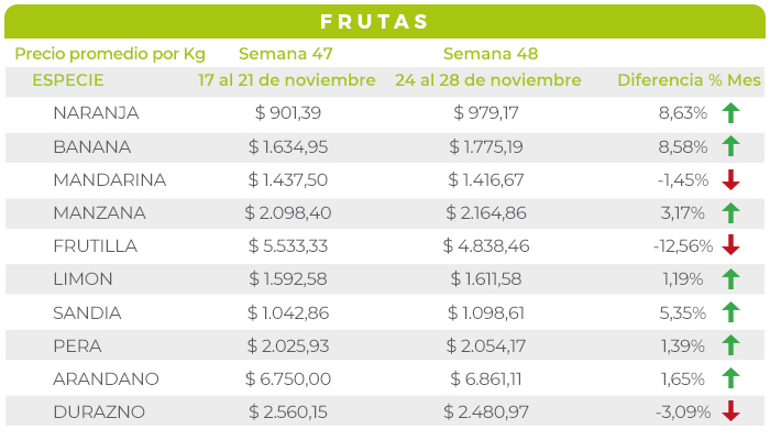 Sin embargo, la FRUTILLA y el DURAZNO registraron leves descensos, impulsados por un incremento en los volúmenes ingresados.