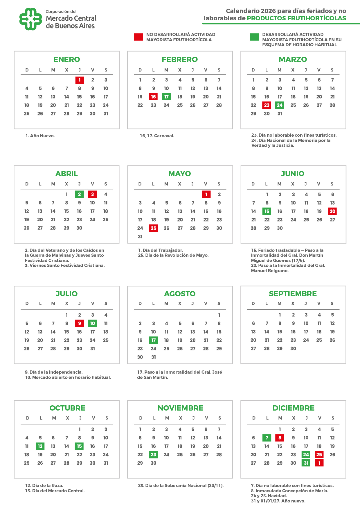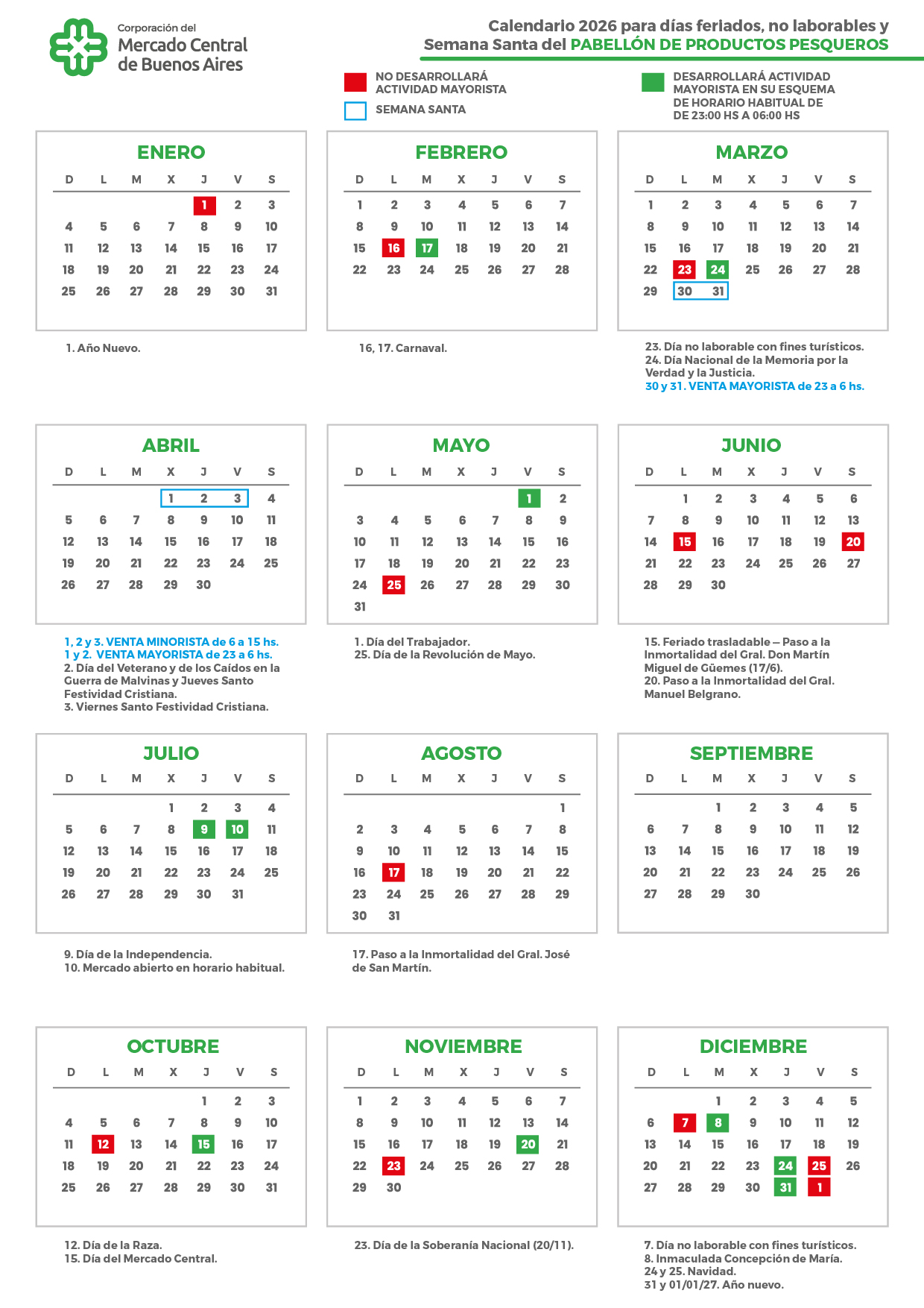 La Corporación del Mercado Central de Buenos Aires, a través de la Resolución 40/2026, informa el “Calendario para días feriados, no laborables y Semana Santa del Pabellón de Productos Pesqueros para el año 2026”