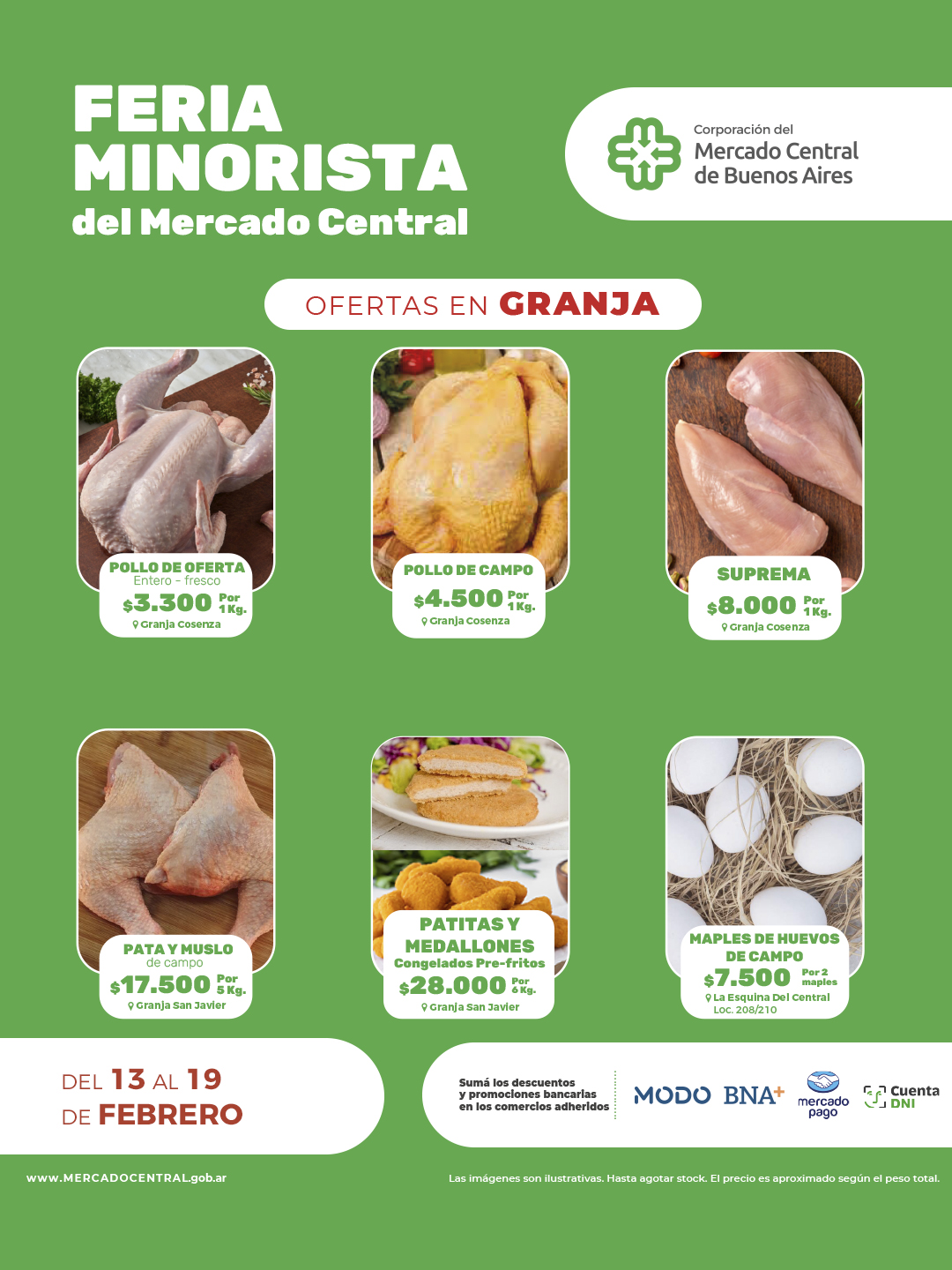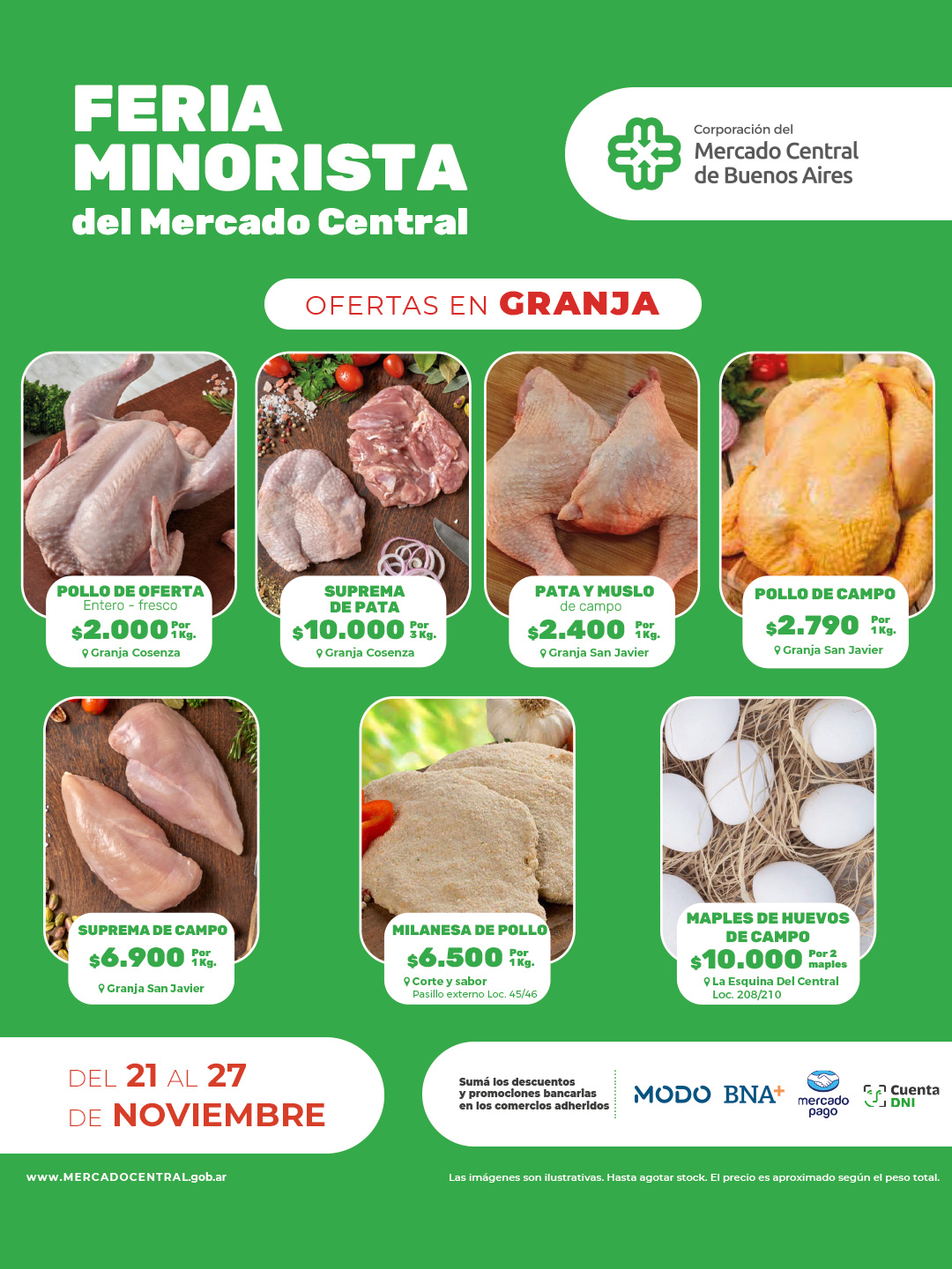 Se suman los descuentos y promociones bancarias todos los SÁBADOS con "Cuenta DNI", y demás promociones bancarias en los locales adheridos (Granja Cosenza - Frigorífico "La Peña" - Granja "San Javier" - Frigorífico "Carnes Ar" - Don Pata - El Argentino - El Capitán - Mar del Plata - Autoservicio "Familiar" - La Cabaña - Jerona - Panadería).