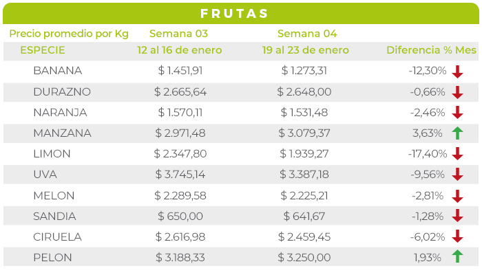 A diferencia de las hortalizas, las frutas tuvieron una baja de precios bastante interesante para el consumidor en esta etapa de la temporada estival. La BANANA continúa con un buen abastecimiento, sumado a un importante remanente en condiciones de madurez avanzada que promovieron los precios hacia la baja.