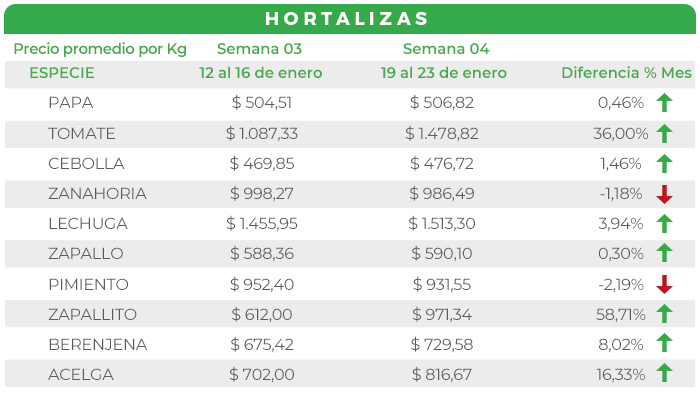 La participación de las hortalizas respecto a la semana anterior, por lo general, subieron un poco, como fue el caso del TOMATE y el ZAPALLITO, que se vieron afectados por las condiciones climáticas con los días frescos, que retrasaron el desarrollo del cultivo. Por este motivo, los ingresos al Mercado se vieron reducidos, lo que provocó un incremento en el precio de venta que, en el caso del tomate fue de un 36 por ciento, y del zapallito, más de un 58 por ciento.