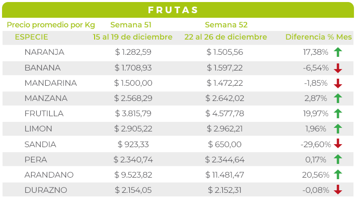 En cuanto a las frutas, BANANA y SANDÍA presentaron una amplia oferta impulsada por las fiestas, situación que produjo un descenso en los precios de venta.