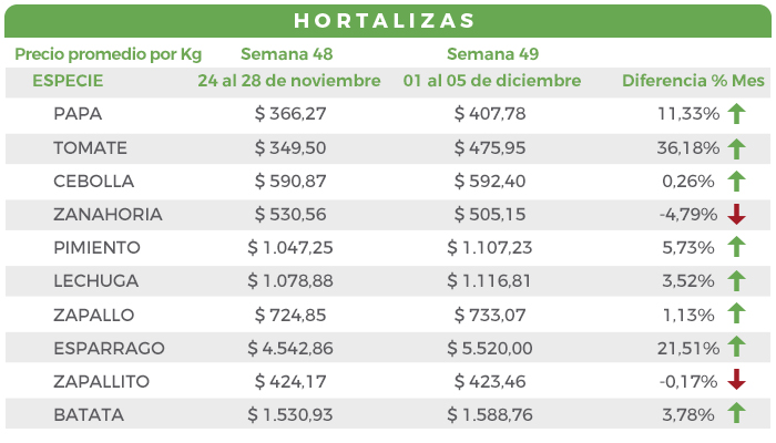 Respecto a la PAPA, la hortaliza pesada por excelencia, tuvo aumento de precio porque se registró un volumen de oferta menor durante la semana, con ingresos de Mendoza. Los ingresos de Mendoza, Tucumán y San Luis están terminando.