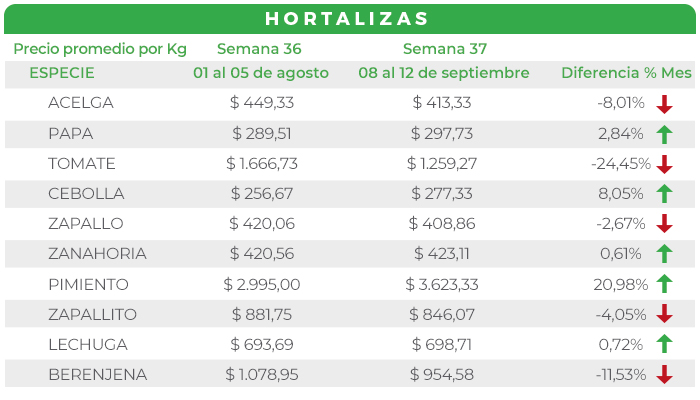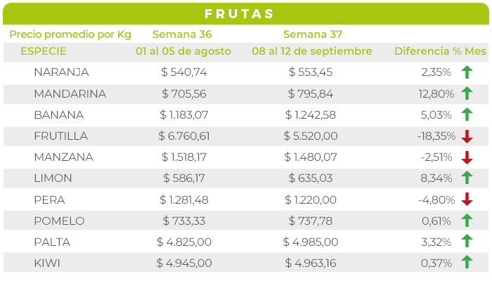 En cuanto a las FRUTAS, el abastecimiento fue adecuado, con variaciones menores en los precios que suelen ajustarse en cada ronda de ventas. No obstante, se destacaron dos excepciones en MANDARINA y FRUTILLA. En el primer caso, debido a las intensas heladas del invierno, la oferta es limitada, lo cual provocó un fuerte incremento en el precio promedio; y en el segundo la amplia disponibilidad, sumada a la participación de casi todas las zonas abastecedoras, resultó en una baja en los valores de venta.