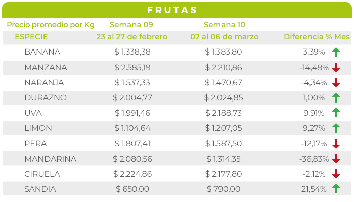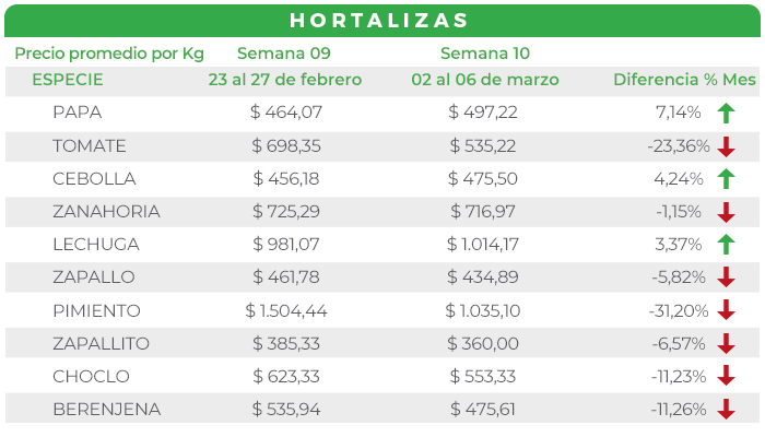 Este reporte presenta la evolución de los precios observados durante las semanas 9 y 10 del año para las principales especies frutihortícolas comercializadas en el Mercado Central de Buenos Aires.
