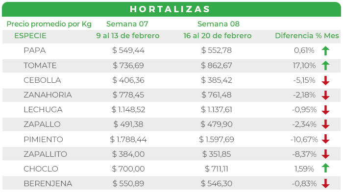El TOMATE, en cambio, mostró una importante alza en sus precios. Esta suba se debe a una disminución en los envíos desde las zonas abastecedoras, que redujeron su actividad debido al feriado de Carnaval.